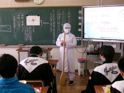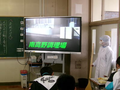 実際に調理する際の服装で、大きなへらを持参して説明しました。また、南高野調理場で給食ができるまでをまとめた動画を見ました。