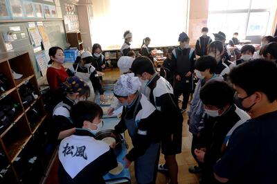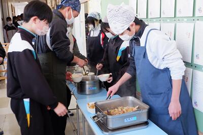 1月24日から30日は全国学校給食週間です。本日は、給食の様子をお送りします。   4校時が終了すると、各学級から給食当番が配膳室に集まってきます。全学年で9クラスあるので、混雑を防ぐために廊下に並んで待機。順番に配膳室から教室へ運びます。   各教室で、短時間で配り終わるように協力して配膳します。人数が多い3年生は、廊下で配膳を行っています。   本来はグループで会食ですが、感染症対策で前向き給食をしています。おいしくいただきます!! <本日のメニュー> ・ご飯・牛乳・納豆・鶏肉と根菜のうま煮・水菜のすまし汁 地場産物である水菜を生かしたメニューでした。
