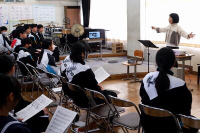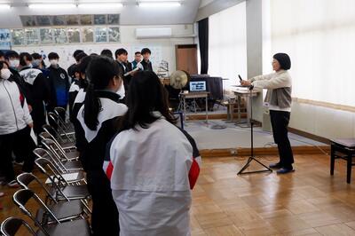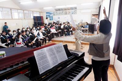 本日は、本校の校歌を作曲していただいた髙見澤淳子さんをお招きして、校歌の歌唱指導をしていただきました。   最初に発声練習と深い呼吸の取り方でウォームアップ後、歌唱指導がスタート。髙見澤さんから「ここは輝くように」「ここから広がっていく感じで」など、曲に込めた思いを含めて一つ一つ説明していただきながら練習が進んでいきます。 練習の最後に、これからの練習に使うために全曲を通して録音を行いました。   今回の歌唱指導は、感染症対策のため代表の学級が直接指導していただき、他の学級は各教室でオンライン試聴したり、歌ったりしました。   最後に生徒代表からお礼の言葉と「これから、大事に歌っていきたい」という気持ちを伝え、今日の活動は終わりました。 1時間の歌唱指導でしたが、髙見澤さんのご指導と生徒たちの頑張りで、上手に歌うことができるようになりました。ご指導ありがとうございました。
