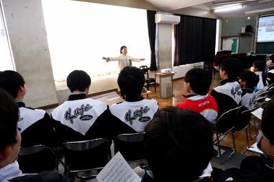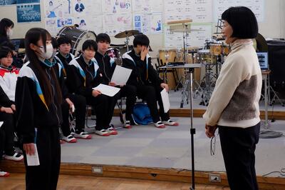 1時間の歌唱指導でしたが、髙見澤さんのご指導と生徒たちの頑張りで、上手に歌うことができるようになりました。