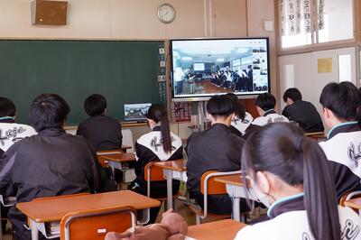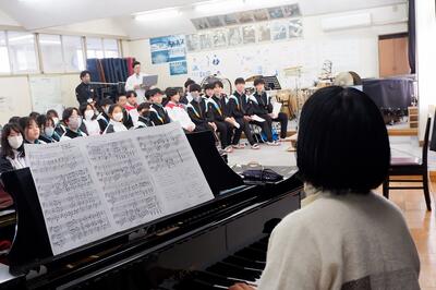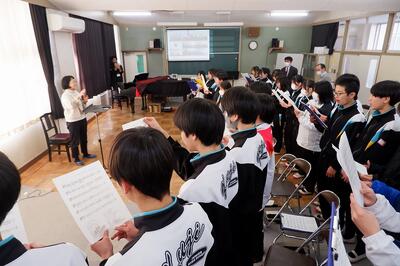 今回の歌唱指導は、感染症対策のため代表の学級が直接指導していただき、他の学級は各教室でオンライン試聴したり、歌ったりしました。