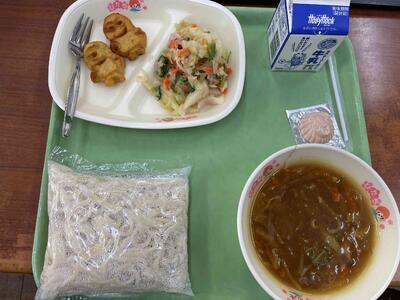 ≪本日の給食≫ ・カレーうどん ・牛乳 ・チンゲンサイとツナのサラダ ・フライドポテト(2個) ・クリームチーズ いちご                             ミニオンポテト初登場!!(3年生のリクエスト)