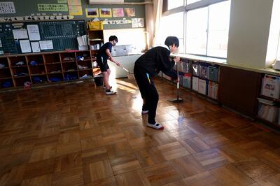清掃の後、環境委員会の生徒が教室の床面にワックスを塗っていきます。