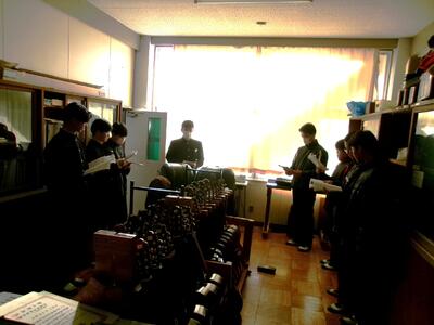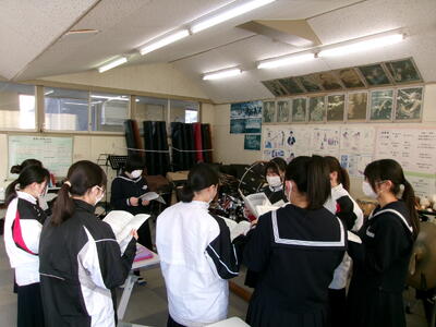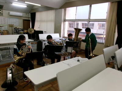 吹奏楽部では、1月下旬に行われる入学予定者説明会の部活動見学の時に演奏する予定の曲を練習していました。